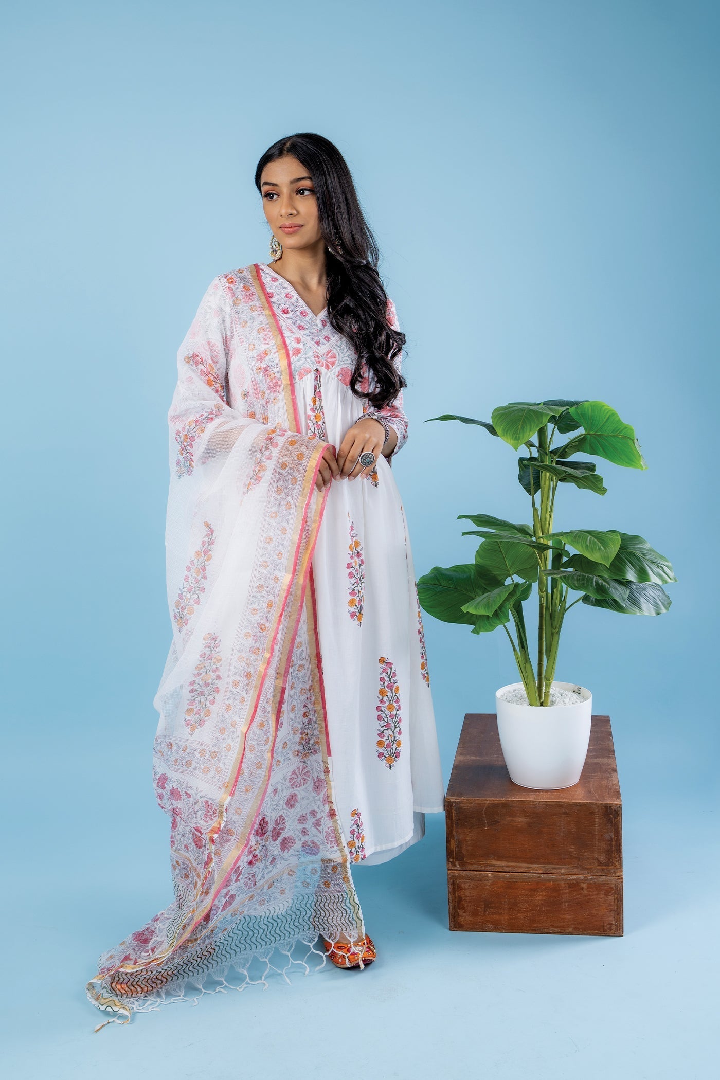 Cotton Anarkali Kurta with 3/4 sleeves, Cotton Pants and 2.5 meters Kota Doria Dupatta.