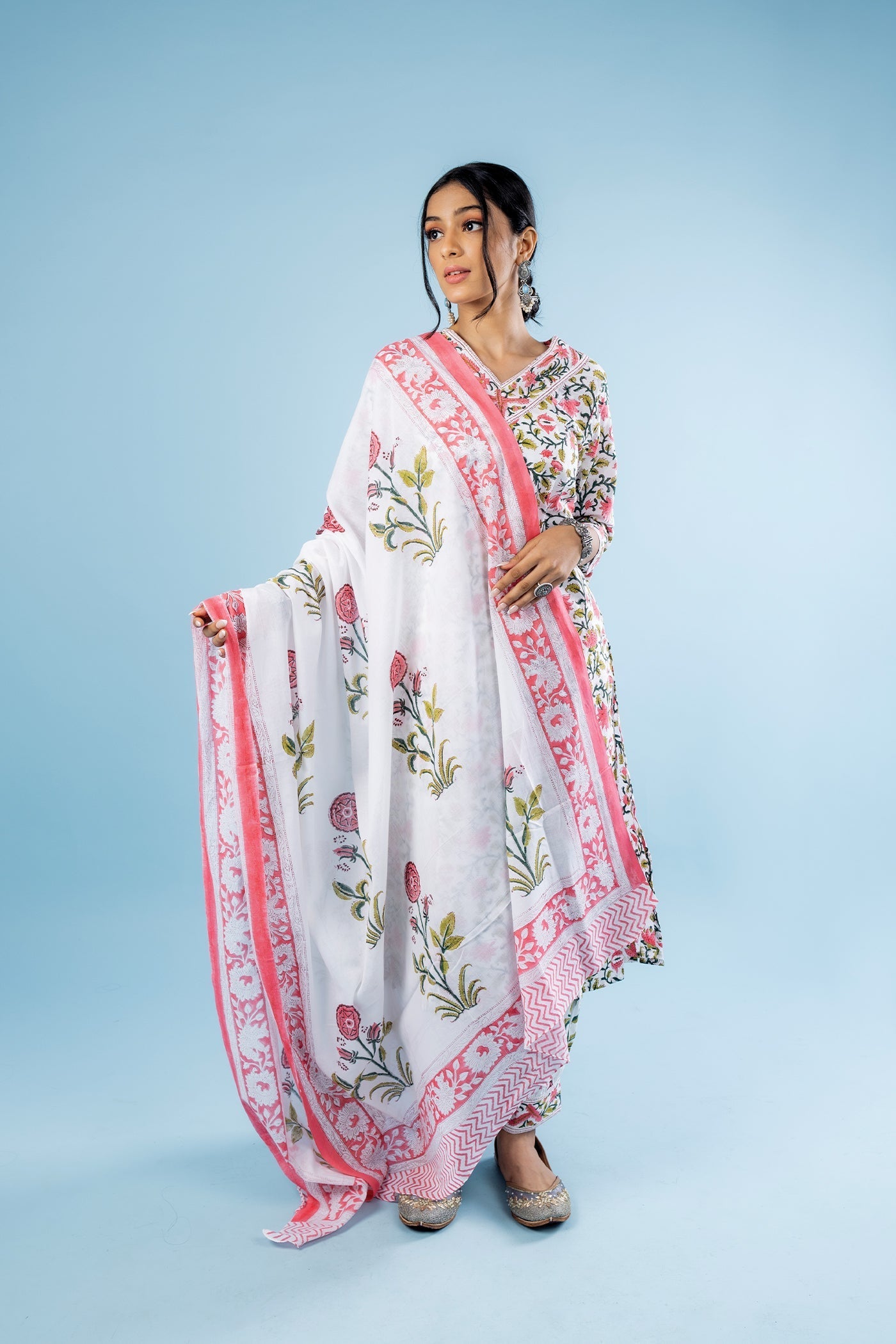 Introducing Sukha, a symphony of colors and grace that captures the very essence of blooming flowers and mughal Poppy flowers. This exquisite ensemble features a hand-block printed straight kurta adorned with intricate floral patterns, harmonizing seamlessly with the accompanying solid color pants and dupatta. Each element of Sukha whispers tales of timeless elegance and comfort, making it a radiant choice for those who seek to embody the beauty of nature in their attire.